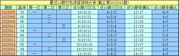 在最近30期开奖中,蓝球在该区出现了10次其中奇数蓝球号码开出3次,偶数蓝球号码开出7次,偶数蓝球走势相对活跃,近期不错连接眷注该区偶数蓝球号码出现。